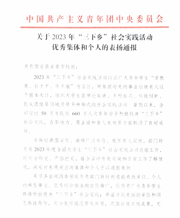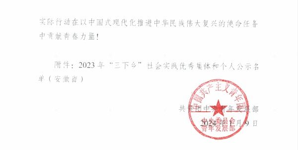 近日,共青团中央下发了《关于2023年“三下乡”社会实践活动优秀集体和个人的表扬通报》。beats365官网 网页版党委书记陆坤喜获“全国社会实践优秀个人”。