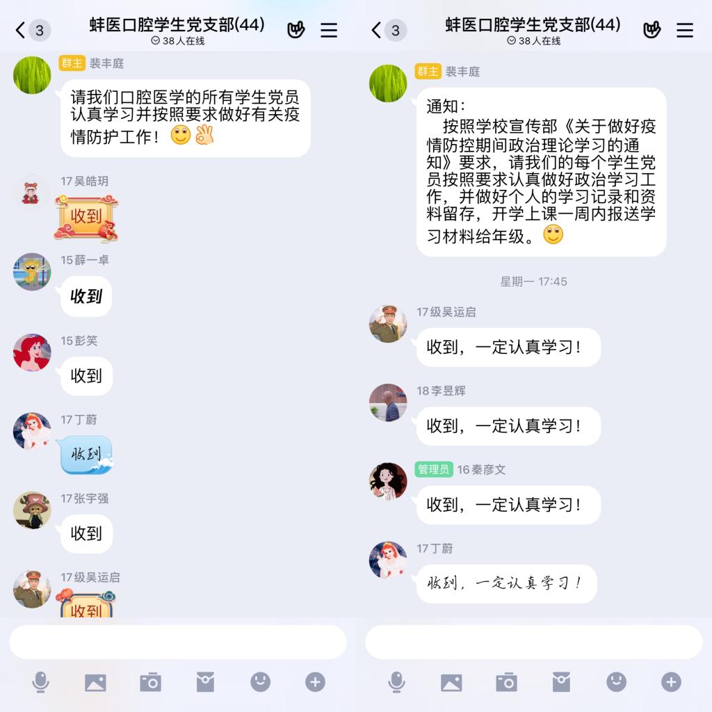 自疫情发生以来,学生党支部认真组织学生的钉钉健康上报工作,要求所有同学于每天上午十点之前全部完成健康情况的如实上报,以便于学校和年级能够第一时间对学生的健康情况进行把控;同时,及时把学校有关部门关于做好学生的疫情防控要求传达到每一位学生,提醒大家在没有接到学校正式开学的通知之前,所有学生一律不得返校;最后,严格按照学校不同部门的要求,及时、认真做好各类情况汇总、表格统计、精神传达等工作。