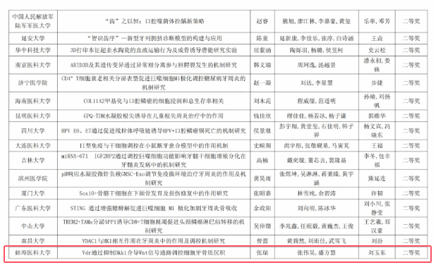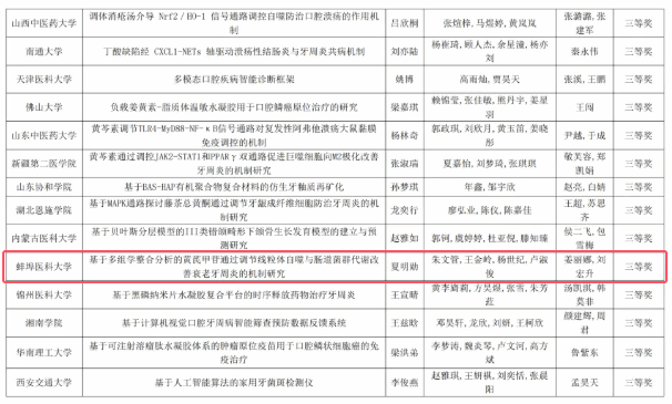 此次竞赛宗旨是崇尚科学、追求真知、勇于创新。口腔医学赛道涵盖了牙颌面的发育机制、组织再生和修复;口腔疾病病因及防治机制;口腔医学相关交叉研究(口腔微生态、人工智能等新兴研究领域)。学院领导高度重视,提早部署、科学谋划,认真选拔,组织指导教师对学生进行全程深度指导。经过激烈角逐,在来自全国医学院校的219组团队中,我院张瑞、张伟昊、盛方慧团队的项目“Vdr通过抑制Dkk1介导Wnt信号通路调控细胞牙骨质沉积”荣获二等奖,夏明勋、朱文管、王金岭、杨世纪、卢淑俊团队的“基于多组学整合分析的黄芪甲苷通过调节线粒体自噬与肠道菌群代谢改善衰老牙周炎的机制研究”荣获三等奖。