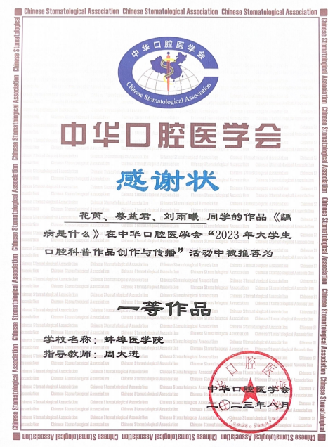 近日,中华口腔医学会公布了“2023年全国大学生口腔科普作品创作与传播活动”作品入选名单。我校beats365官网 网页版本科生花芮、蔡益君、刘雨曦团队提交的参赛视频作品《龋病是什么》荣获全国一等奖。