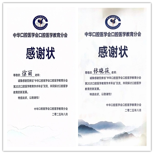 本次口腔医学教育学术年会以“立德树人引领口腔医学教育卓越发展”为主题,设置大会主题报告、“教材强基”“教改领航”“数智赋能”“思政铸魂”四大分会场及学生思政成长专场,邀请国内外口腔医学教育领域知名专家学者围绕教材建设、教学改革、数字化技术应用、思想政治教育等多个维度,深入探讨口腔医学教育的创新发展路径。学院提前筹划、积极备赛,组织参加青年教师授课展示、教案与笔记展示、论文征稿、学生思政成长展示等活动。教师代表在教案评选及论文交流中取得优异成绩。张晓筱老师撰写的教案凭借创新的教学设计、扎实的思政融合案例,成功入选年会“优秀教案”,展现了学院在课程思政建设中的深耕与实践。徐丽老师撰写的论文入选“思政铸魂分论坛”优秀论文并获邀进行现场交流,受到与会专家一致好评,为口腔医学教育思政工作提供了有益参考。